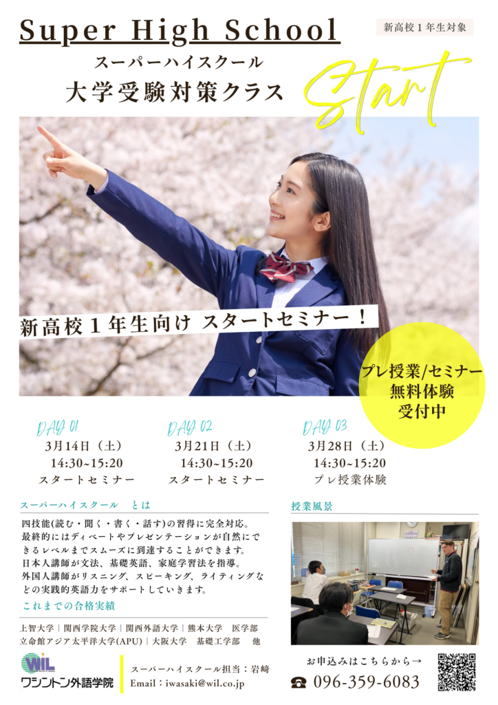 大変ご好評いただいている高校生対象のスーパーハイスクール・大学受験対策クラス春セミナーのご案内です!
