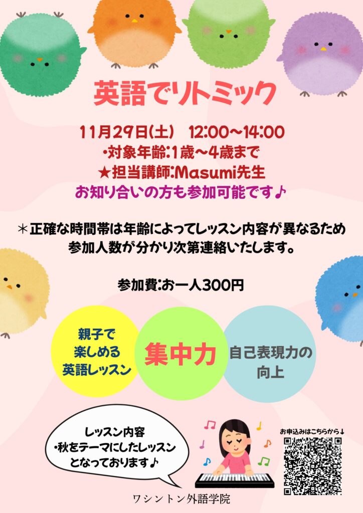 11月29日(土)12:00~14:00、英語でリトミックを行います。