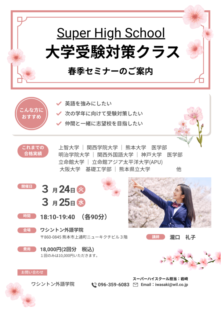 大学受験対策クラスの春セミナー✿3/24(火)と3/25(水)の開催決定!