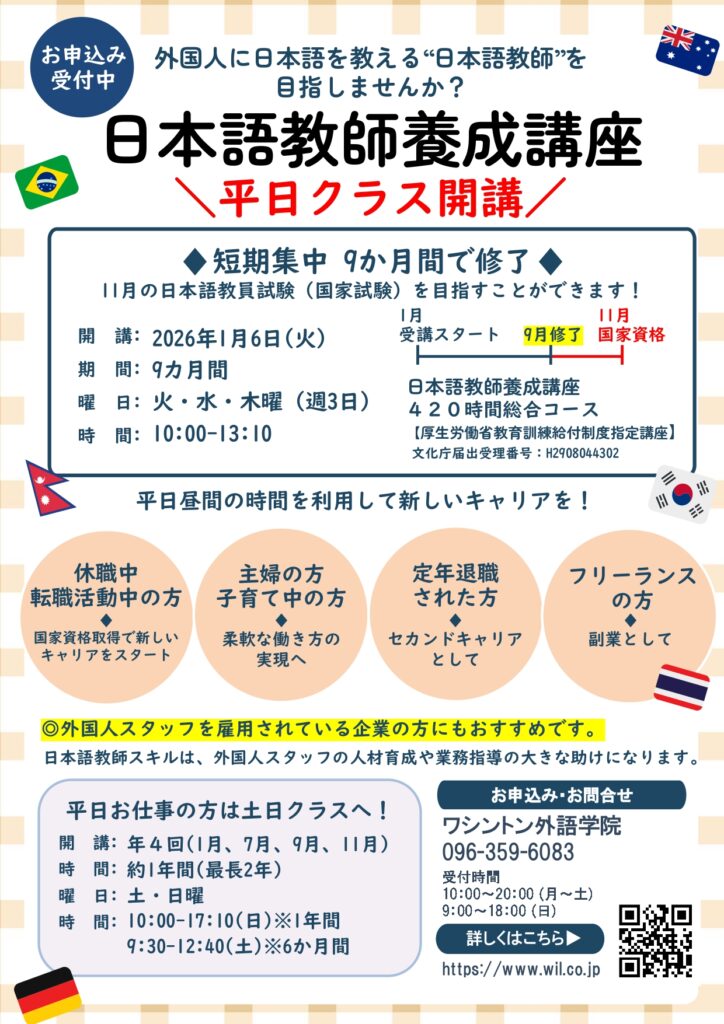 詳しい情報はこちらをご覧ください→日本語教師養成講座|熊本・英会話スクールのワシントン外語学院